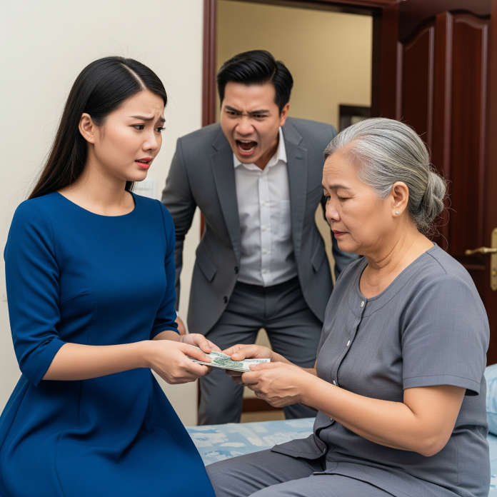 – Cô làm cái gì vậy hả Hoa?! – Hưng gằn giọng, bước tới, mặt đỏ bừng. – Tiền đâu mà cô đưa mẹ cô nhiều thế này?