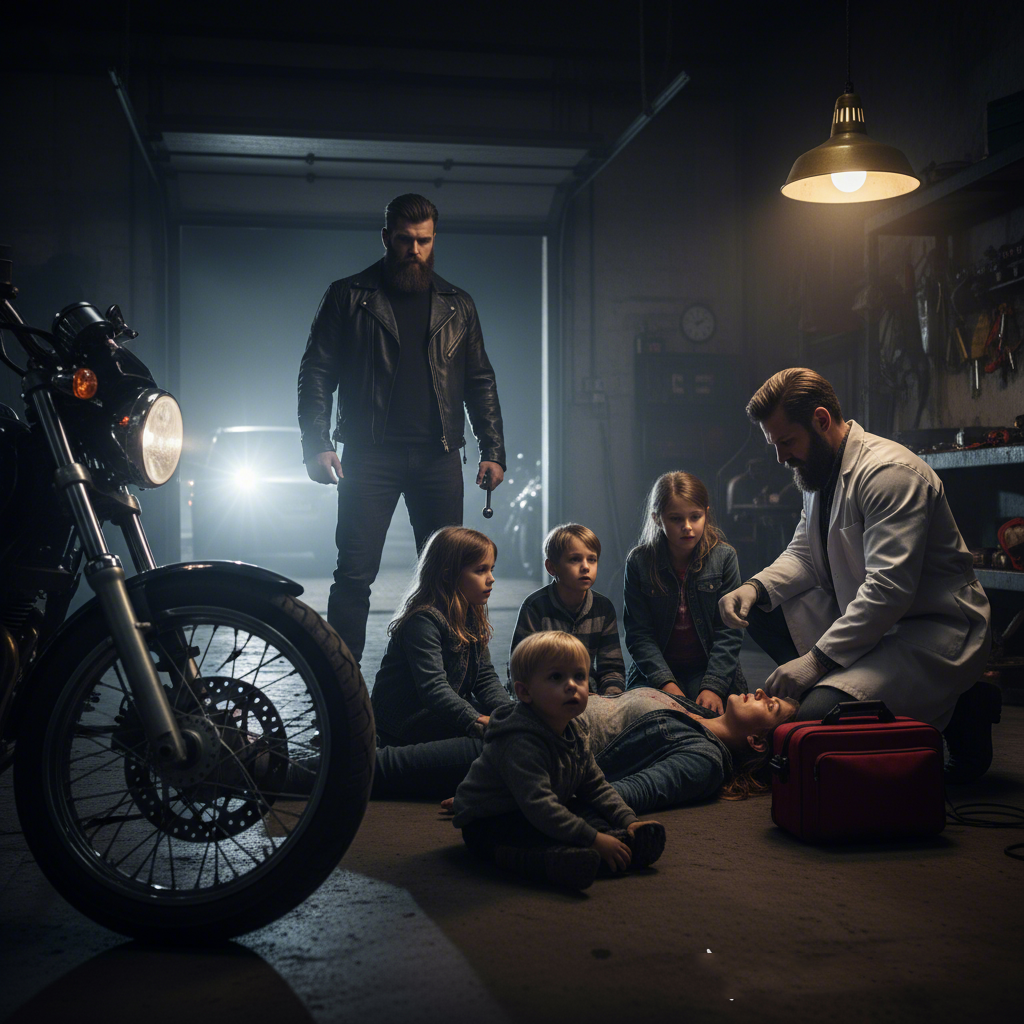 Jackson “Jax” Mercer froze at the doorway, wrench in hand, chain lube in the air, the bitter bite of black coffee lingering in his chest. Four small shapes huddled around a woman lying on a creeper, her sleeve dark with blood, breath misting in the freezing garage. The oldest girl, Maren, squared her shoulders as though bracing the world. Little Theo peeked from beneath a blanket that barely reached his toes.