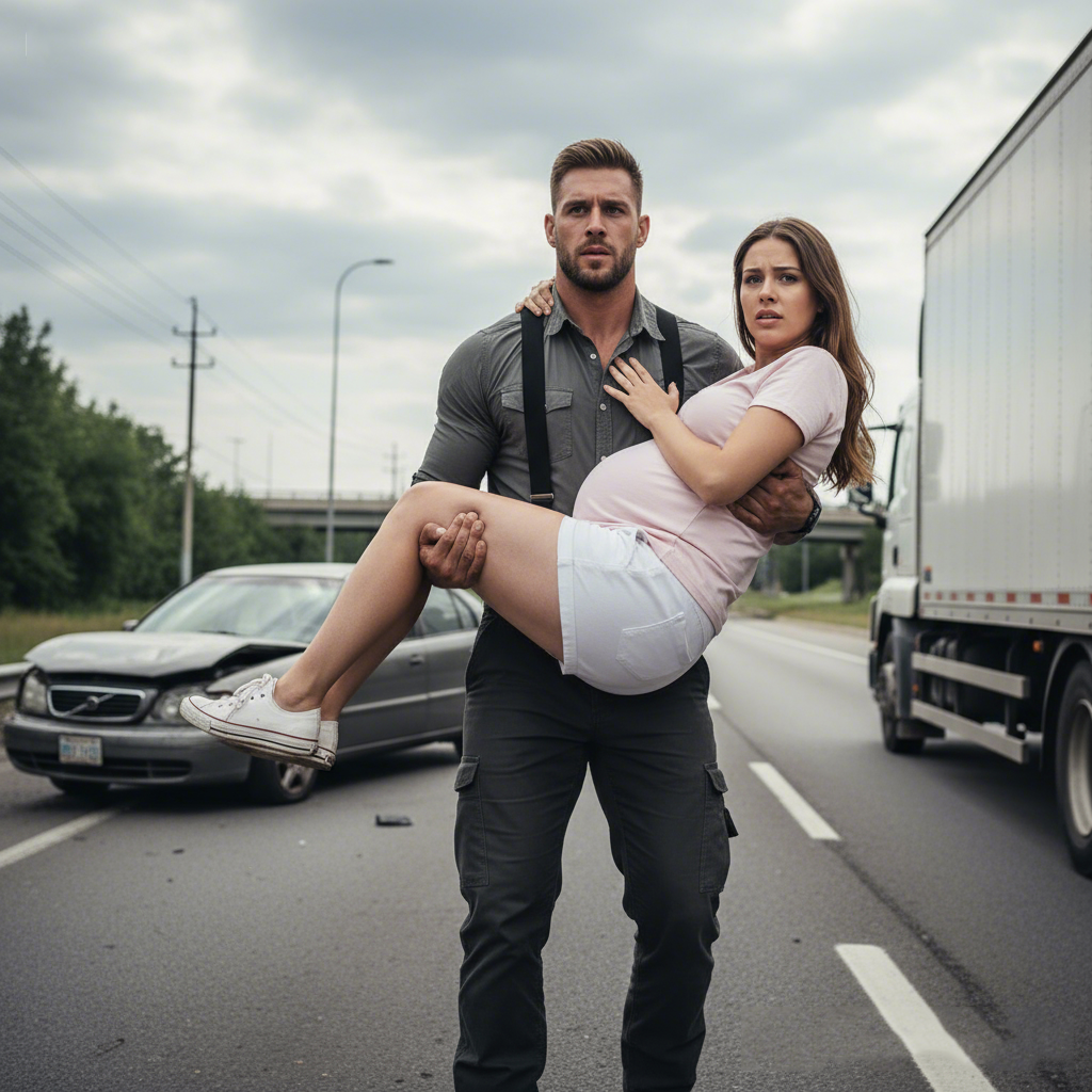 The silence of the road shattered suddenly. A scream echoed across the highway, sharp and panicked. Kevin’s heart raced as he slammed on the brakes, skidding slightly on the ice. Up ahead, a car had swerved into the ditch, smoke curling from its hood. And there, beside the overturned vehicle, a young woman clutched her swollen belly, groaning in pain.