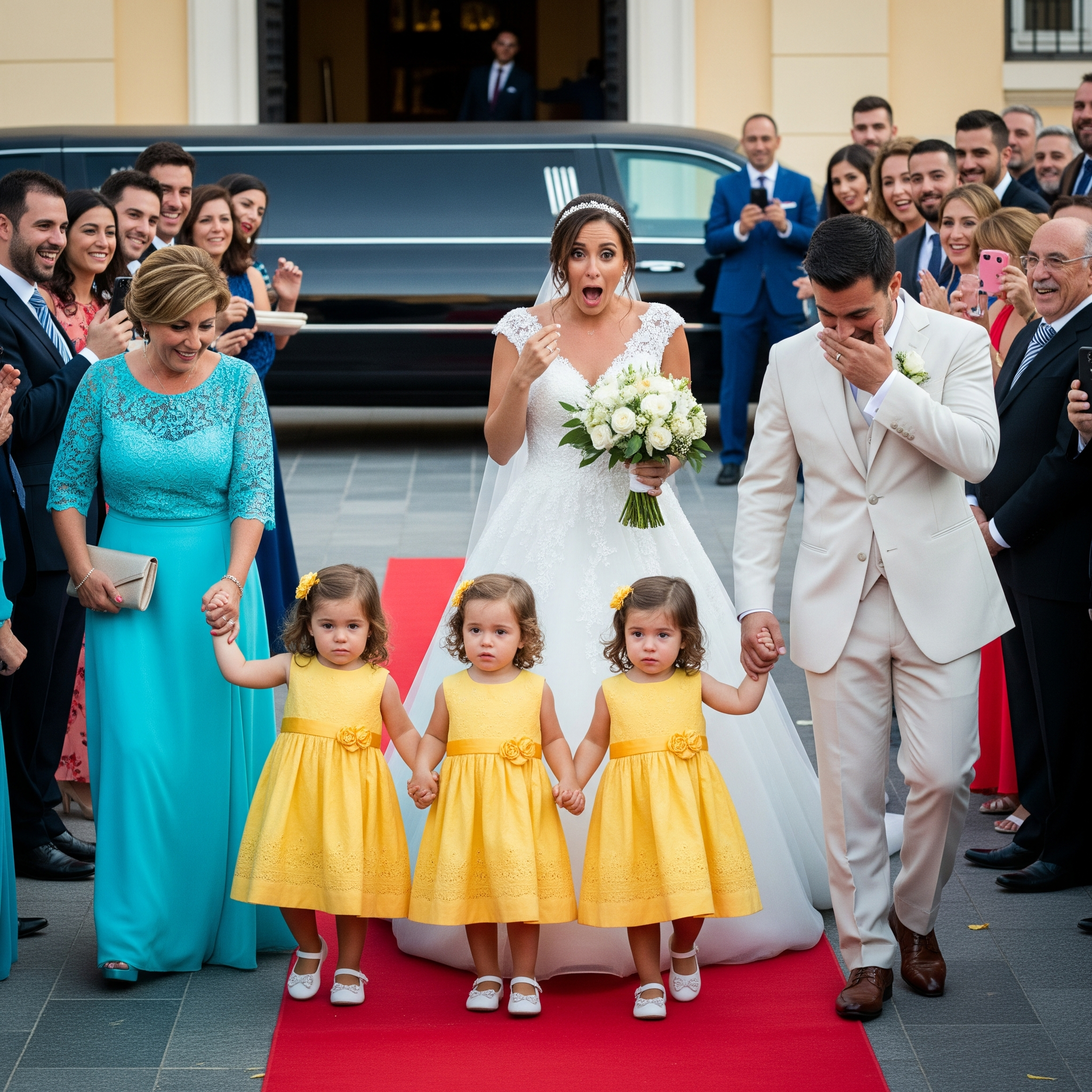 Lucía salió del coche con un vestido azul marino que realzaba su figura, su cabello recogido con sencillez, y tres pequeños de apenas un año tomados de la mano de su niñera. Los murmullos se esparcieron como fuego: