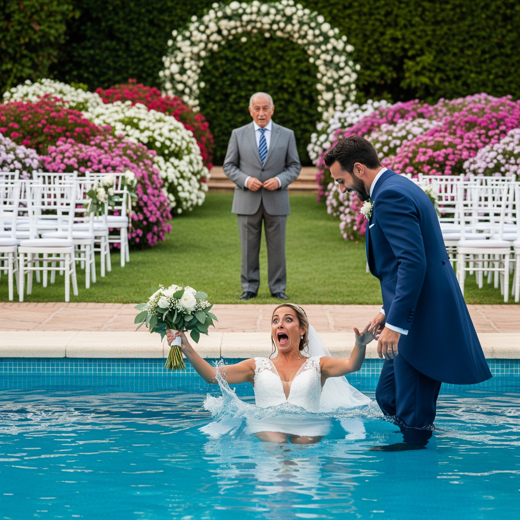 Intenté salir, pero el vestido mojado se me enredaba en las piernas. Un camarero y mi primo corrieron a ayudarme. Cuando por fin pude pisar firme en el borde, el frío me hacía temblar sin control. Él se acercó, todavía riendo, y dijo:
