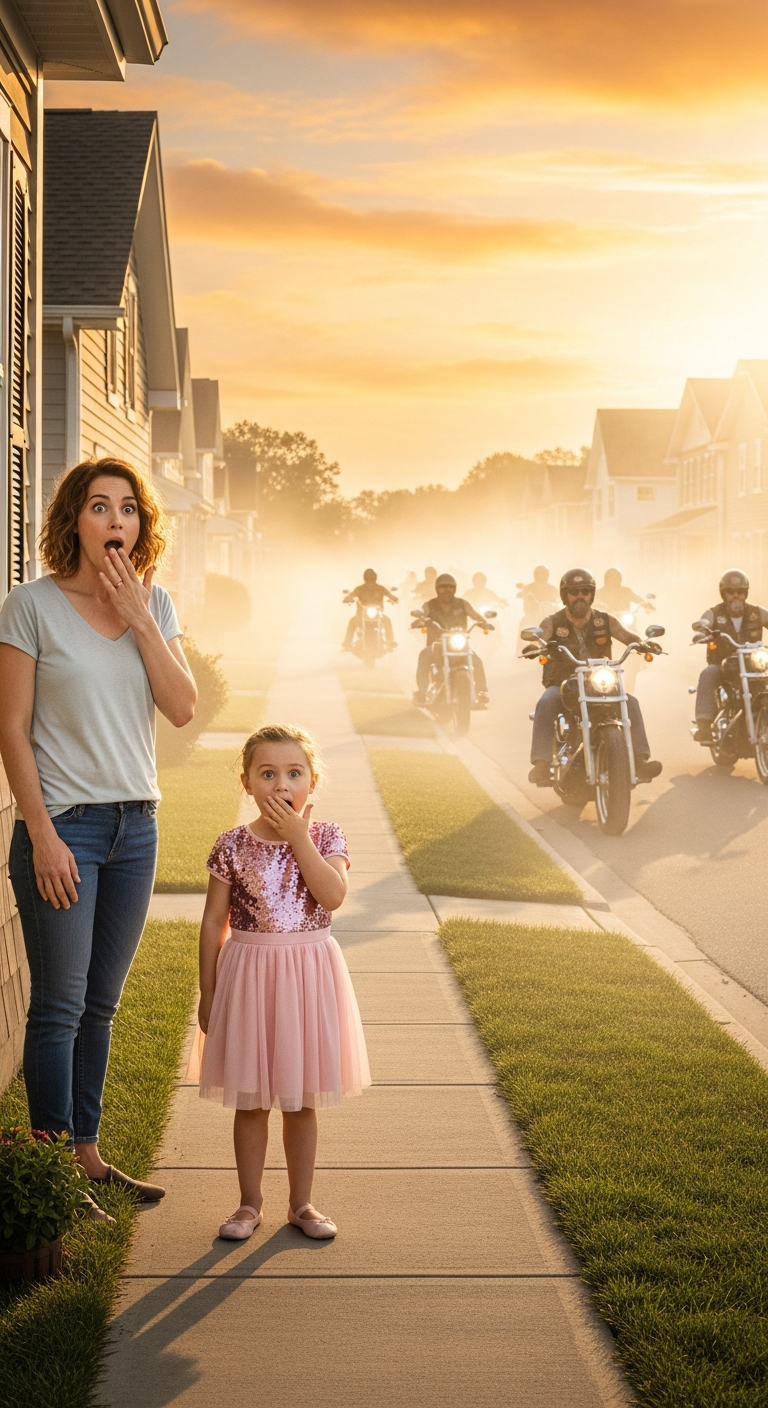 A long line of motorcycles—maybe fifteen, maybe twenty—rounded the corner and roared down our street in formation. Their engines shook the ground as they slowed in front of our house, chrome gleaming under the afternoon sun.