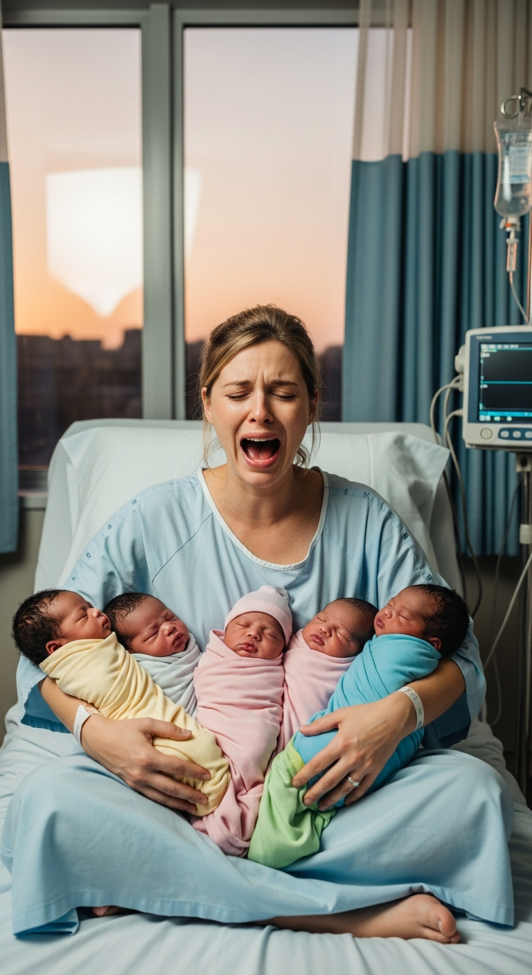 On the hospital bed, Emily Carter, exhausted from 15 hours of labor, lifted her head weakly. Her arms cradled two of the infants while the nurses tended the other three. Sweat clung to her temples, her voice trembling as she whispered, “They are ours, Daniel. They are your children.”