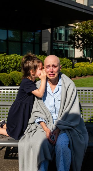 I had dragged myself downstairs for some air, IV port still taped to my arm, when I noticed a little girl—maybe eight or nine—kneeling near the hospital’s small garden pond. She had braids, a pink jacket, and a quiet, cautious expression.