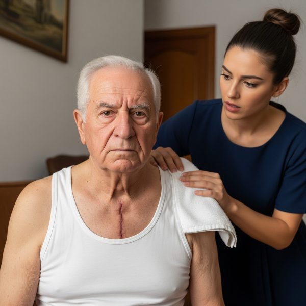 Yo estaba ayudando a mi suegro, que está paralizado, a bañarse. Pero en cuanto le quité la camisa, me quedé paralizada: las palabras de mi esposo antes de irse de viaje resonaron en mi cabeza y entendí por qué siempre temía que yo entrara en la habitación de su padre.