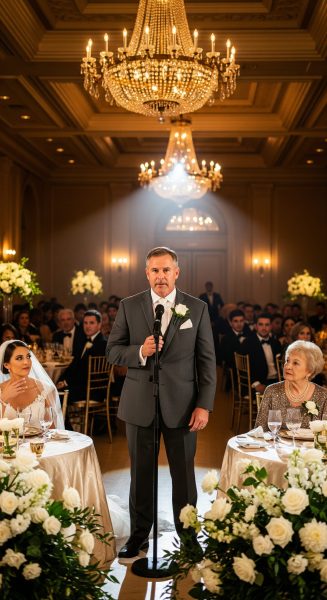As the wedding speeches began, my mother-in-law announced, “The apartment stays in our son’s name—she gets nothing.” Silence spread across the room. My father stood up, dusting off his travel-worn sleeves, and said, “Now, allow me to talk.” What followed made her regret every word.