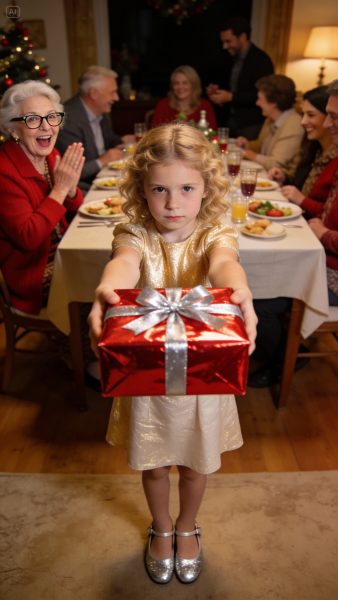 During the family gathering, my in-laws distributed lavish gifts to every grandchild except mine, saying she wasn’t really theirs. My husband said nothing. Then my 7-year-old quietly handed a box to her grandmother and said it was for her if she ever dismissed her again. When she unwrapped it, her reaction shocked everyone.