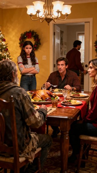 En Acción de Gracias, el timbre sonó y era un hombre sin hogar pidiendo comida. Mi madre quiso darle dinero y cerrar la puerta, pero mi padre dijo algo inesperado: “Pon otro plato. Come con nosotros.” Yo estaba furiosa, avergonzada. Durante la cena apenas lo miré. Hasta que el hombre levantó la vista y dijo una sola frase. Vi el color desaparecer del rostro de mi padre. En ese instante entendí que no sabíamos a quién habíamos dejado entrar en casa.
