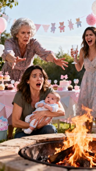 My family threw a backyard baby shower, but happiness turned into horror in an instant. My mother held my baby, cold and furious, “You gave birth before your sister? You betrayed us.” She flung my newborn toward the flames. My sister raised her glass, laughing, “You caused this.” I screamed and lunged forward, heart pounding, but what happened next was unthinkable—an event that would shake me to my core and rewrite the story of my family forever.