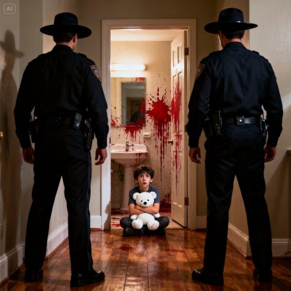 Leo estaba de rodillas en el suelo de madera oscura. Abrazaba con fuerza a su oso de peluche marrón, sus pequeños dedos hundiéndose en la felpa. Sus ojos, grandes y llenos de lágrimas, miraban hacia arriba, hacia los oficiales que lo flanqueaban. Detrás de él, la puerta del baño estaba abierta de par en par. Una luz roja, quizás de una lámpara de calefacción o un efecto decorativo que Arthur había instalado, bañaba el interior del cuarto de baño, creando una atmósfera infernal. Se veían manchas rojas en el lavabo, en las paredes inmaculadas, y un rastro que salía hacia el pasillo. Leo nos miró y, con una voz que rompió el alma de los presentes, dijo: