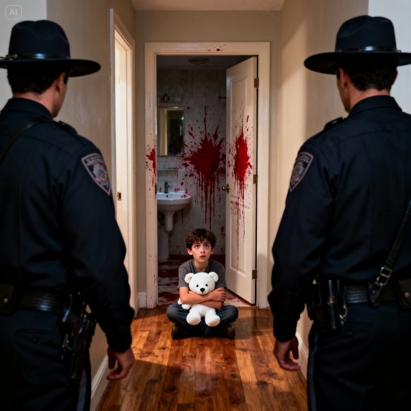 Leo estaba de rodillas en el suelo de madera oscura. Abrazaba con fuerza a su oso de peluche marrón, sus pequeños dedos hundiéndose en la felpa. Sus ojos, grandes y llenos de lágrimas, miraban hacia arriba, hacia los oficiales que lo flanqueaban. Detrás de él, la puerta del baño estaba abierta de par en par. Una luz roja, quizás de una lámpara de calefacción o un efecto decorativo que Arthur había instalado, bañaba el interior del cuarto de baño, creando una atmósfera infernal. Se veían manchas rojas en el lavabo, en las paredes inmaculadas, y un rastro que salía hacia el pasillo. Leo nos miró y, con una voz que rompió el alma de los presentes, dijo:
