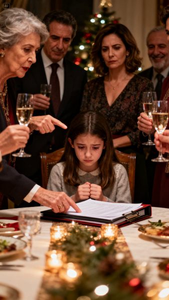 En plena cena de Navidad, mi suegra alzó su copa y sonrió: “Estoy orgullosa de todos mis nietos… excepto de uno”. Luego señaló a mi hija de nueve años. Algunos rieron, como si fuera una broma. Yo vi cómo mi niña luchaba por no llorar. Mi esposo no rió. En silencio, colocó una carpeta gruesa sobre la mesa. Cuando empezaron a hojearla, las risas murieron, las copas quedaron inmóviles y el aire se volvió pesado. Nadie estaba preparado para lo que esas páginas revelaban.