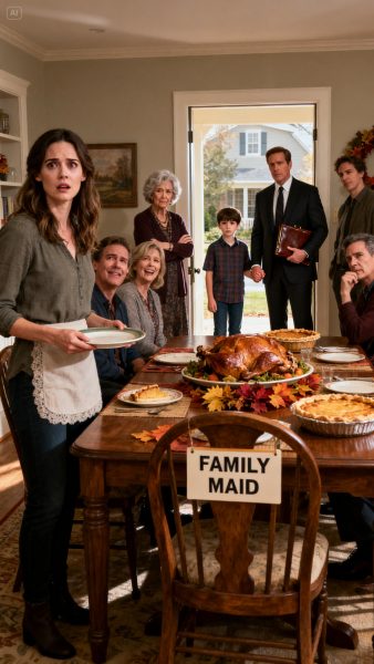 I walked in for Thanksgiving, expecting family cheer, and instead saw a chair labeled FAMILY MAID. My mother-in-law smirked, telling me I’d still be serving, and the family laughed at my expense. Shock froze me in place. Then my son came in with a man in a suit carrying a folder. “We’re delivering a legal notice,” he said. The room fell silent, and everything changed in a heartbeat.