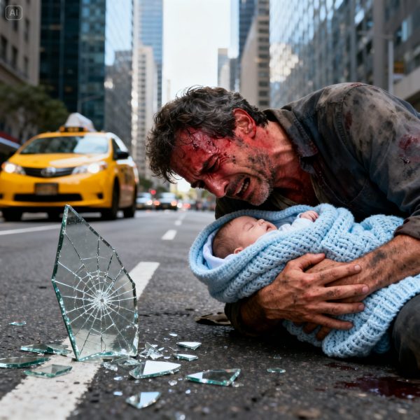 El impacto fue brutal. No atrapé al bebé suavemente como en las películas. Chocamos con violencia. Para amortiguar su caída, giré mi cuerpo en el aire, usando mi propia espalda como escudo contra el asfalto y estrellándome contra un panel de vidrio de una parada de autobús cercana. El sonido del vidrio estallando y mis costillas crujiendo se mezcló con el llanto del bebé. Quedé tendido en el suelo, con la cara ensangrentada y el cuerpo gritando de dolor, pero con el niño seguro, apretado contra mi pecho, tal como me fotografiaron los transeúntes segundos después.