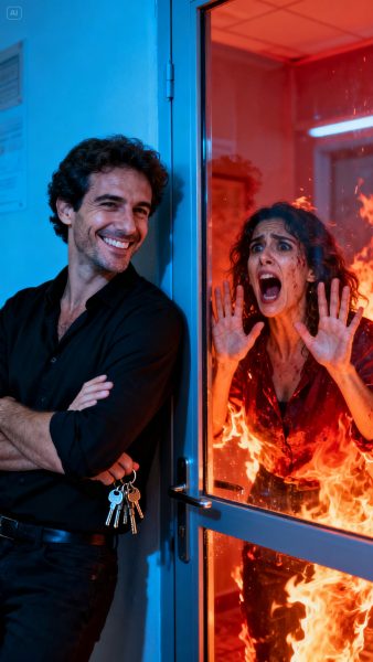 Cerró la puerta con llave y el clic metálico sonó más alto que el primer estallido del fuego. Yo estaba de siete meses. El calor subió de golpe, como si la casa hubiera decidido respirar llamas. Él se dio la vuelta en el rellano, con una sonrisa torcida, y dijo riendo: