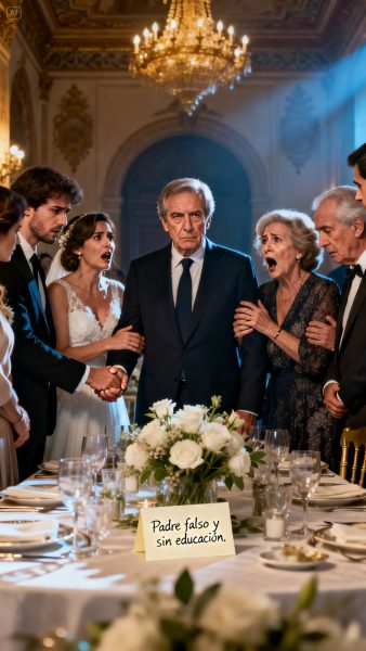 Asistí a la boda de mi hijo, Lucas, y vi cómo su familia política se reía de mí. Mi tarjeta decía: “Padre falso y sin educación”. Sentí que el mundo se derrumbaba, pero mi hijo me tomó del brazo: “Papá, vámonos a casa.” Esa noche no dormí, pensando en cómo mostrarles que subestimarme sería su mayor error. Al día siguiente, algo ocurrió en la empresa de su familia que nadie esperaba… y todos quedaron sin palabras.