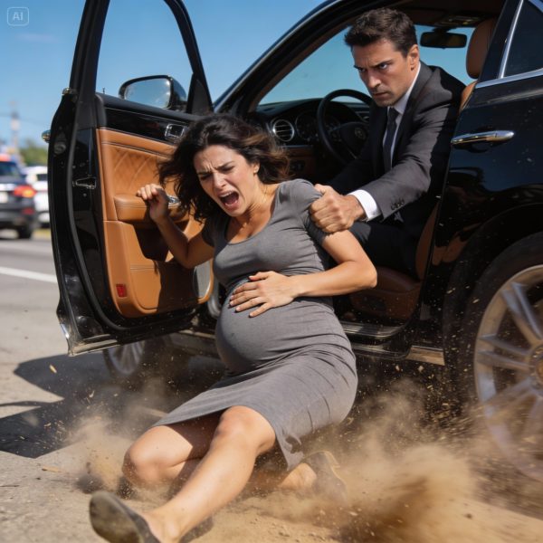 La voz de Julián rebotó en el callejón oscuro como un golpe. Yo, Lucía, con ocho meses de embarazo, apenas tuve tiempo de reaccionar. El Mercedes frenó de golpe, mi vientre se tensó por el impacto del cinturón y, antes de que pudiera agarrarme a algo, él abrió la puerta y me empujó hacia afuera.