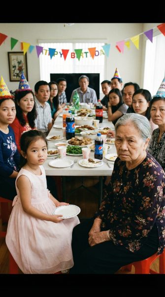 Một tiếng “choang” vang lên khi ai đó làm rơi ly rượu. Tiếng nhạc tắt ngấm. Không gian đông cứng lại. Hàng chục ánh mắt đổ dồn về phía tôi, rồi về đứa trẻ đang ngơ ngác trong tay tôi, không hiểu chuyện gì vừa xảy ra.