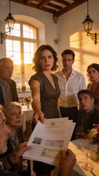 El punto crítico llegó durante una reunión familiar programada por Elena bajo el pretexto de celebrar el fin de la boda. Reunió a todos en el salón principal del cortijo, con documentos y pruebas listas. Con calma, comenzó a exponer cada irregularidad, mostrando transferencias, mensajes y acuerdos secretos. Algunos familiares se pusieron pálidos, otros intentaron mentir, pero no pudieron negar las pruebas.