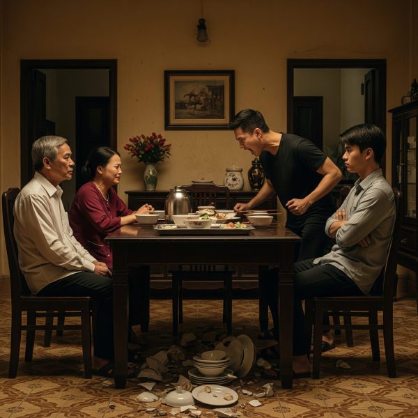 Cả bàn ăn đông cứng. Bố tôi ngẩng lên, đôi tay run run. Mẹ sững lại, thìa canh dừng giữa không trung. Tôi còn chưa kịp hiểu chuyện gì, thì người đàn ông hiền lành, nhẫn nhịn suốt bao năm—chồng tôi—bất ngờ đứng bật dậy. Một tiếng “rầm” nặng nề vang lên khi anh lật tung cả mâm cơm.