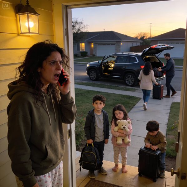 Por un segundo, me quedé paralizada tras la puerta. Mi cerebro no podía procesar lo que veía. Tres niños , medio dormidos, con sus mochilas agarradas, de pie en mi porche mientras sus padres cargaban el coche como si fuera una guardería normal.