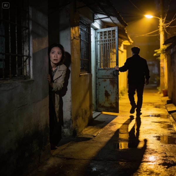 Không kịp suy nghĩ, tôi theo xuống cầu thang. Dưới ánh đèn vàng vọt, bóng Minh đổ dài trên nền xi măng ẩm ướt. Anh rẽ ra khỏi khu tập thể, đi về phía con hẻm tối phía sau chợ đêm đã đóng cửa.