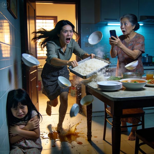 Không kìm được nữa, tôi lao tới… lật tung cả mâm cơm. Bát đĩa vỡ choang. Canh nóng bắn lên tay tôi rát buốt, nhưng cơn tức còn nóng hơn.