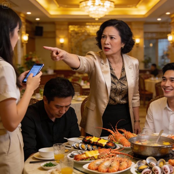 Đến nhà hàng hải sản khá sang, bàn ăn có đủ: ba chồng tôi – ông Tư, em chồng – Vy, chồng Vy là Hải, thêm hai đứa cháu. Vừa ngồi xuống, bà Hường cầm menu gọi như… người vừa trúng số.