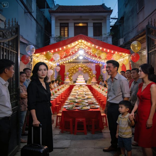 Tôi về tới, cả con hẻm đã dựng rạp. Đèn nhấp nháy, bóng bay xanh đỏ, khách khứa đông như đám cưới. Tôi đứng từ xa nhìn thấy Thảo – bồ nhí của chồng – mặc váy đỏ, tay dắt thằng bé. Còn Hưng thì bận rộn tiếp khách, cười tươi như một người đàn ông thành đạt.