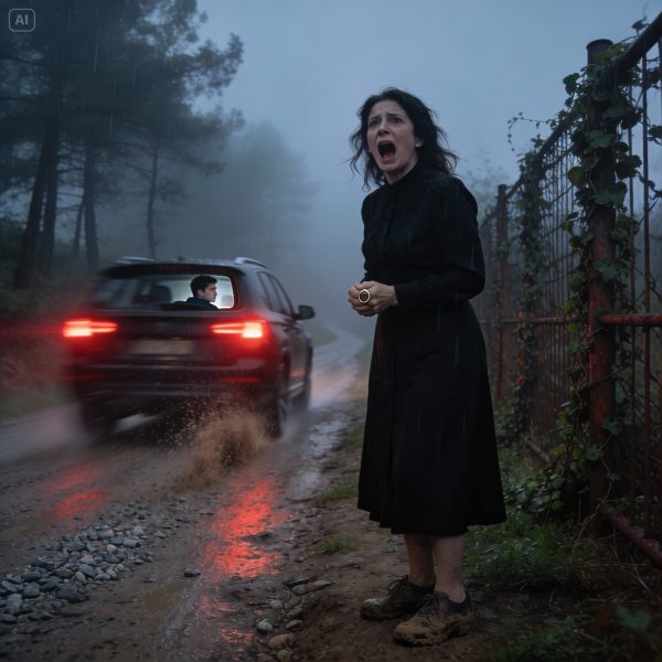El motor arrancó con fuerza. La grava me salpicó las piernas mientras se alejaba, y las luces traseras se disolvieron en la niebla. Me quedé temblando, sola —sin teléfono, sin dinero, sin coche—, agarrando mi anillo como si fuera la última prueba de que mi vida había sido real.