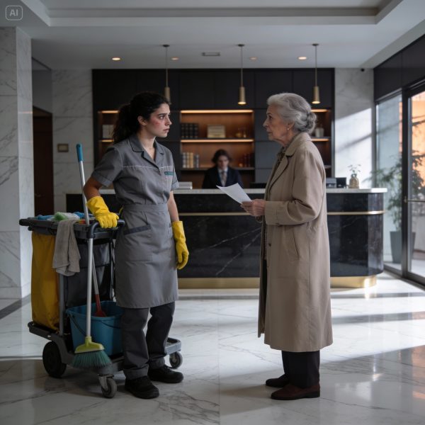 Dos semanas después, entré al vestíbulo de su edificio para dejar una carta de la escuela que había llegado a mi dirección por error, y allí estaba ella, con guantes de goma y un delantal de conserje, empujando un carrito de productos de limpieza, con los ojos fijos en el suelo mientras fregaba la puerta del baño.