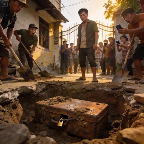 Chỉ vài phút, họ đào lộ hẳn một hộp sắt cỡ bằng cái vali, có khóa móc cũ kỹ, trên nắp còn dính bùn đặc và vài vệt rỉ đỏ. Điều lạ nhất là hộp được bọc thêm một lớp vải bố mục, cuộn rất kỹ, như thể ai đó cố tình giấu cho thật sâu.