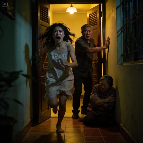 Tôi bật dậy lao ra thì thấy Ngọc tóc tai rối bù, lao khỏi phòng, mặt trắng bệch như bị bóp nghẹt, áo ngủ xộc xệch. Ngay sau đó, cửa phòng em trai Hải bật mở, Hải cũng từ phòng tôi chạy ra, mắt anh hoang dại.