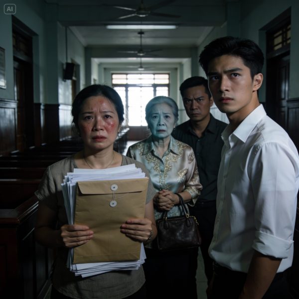Tôi kéo Vinh ra khỏi nhà chồng, cả hai đứng dưới mái hiên tòa án. Gió lạnh phả qua, nhưng trong lòng tôi nóng rực như có lửa đốt. Tôi nhìn phong bì trong tay, vừa đau vừa tức, lại vừa thấy… nhẹ.