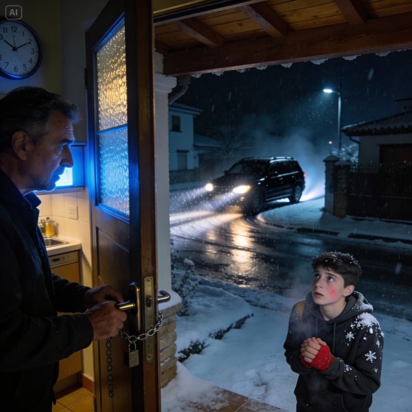 No fue un timbre cortés: tres toques fuertes, frenéticos. Me moví sin pensar, caminando hacia la puerta principal como si me estuviera jalando. A través de la estrecha ventana lateral, vi una figura en mi porche: un adolescente , delgado, con la capucha puesta, hombros temblorosos. Se movía de un pie a otro, frotándose las manos como si intentara calentarse los huesos.