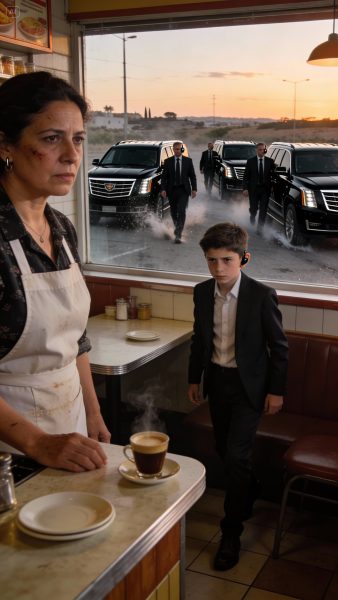 El diner quedó vacío en cuestión de segundos. Los clientes habituales pagaron rápido, incómodos, evitando mirar a los hombres de traje. El jefe salió de la cocina, pálido, pero uno de los escoltas levantó la mano y lo hizo retroceder sin decir una palabra.