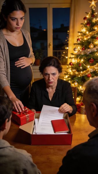 En plena Navidad, con la familia reunida y las luces encendidas, anuncié que estaba embarazada. El silencio duró un segundo. Luego, el rostro de mi madre se endureció y gritó que yo y ese “hijo ilegítimo” no volveríamos a pertenecer a la familia. Dijo que estaba muerta para ella y que me había borrado del testamento. No discutí. Dejé mi regalo sobre la mesa y me fui. Cuando abrió la caja, sus gritos rompieron la noche.