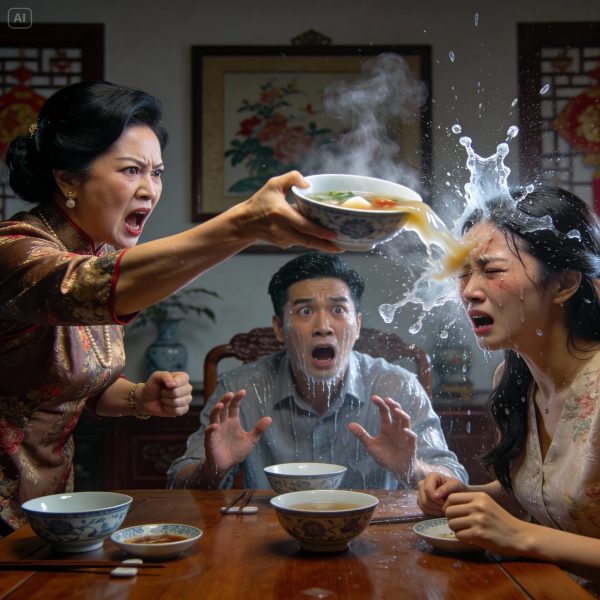 Tôi còn chưa kịp hiểu “thứ người” là thứ gì thì bà bưng tô canh trước mặt, hất thẳng. Nước canh nóng tạt vào má, chảy xuống cổ, mùi hành tiêu bốc lên cay xè. Tôi chết sững, bàn tay run đến mức không lau nổi. Bà đứng bật dậy, chỉ thẳng: