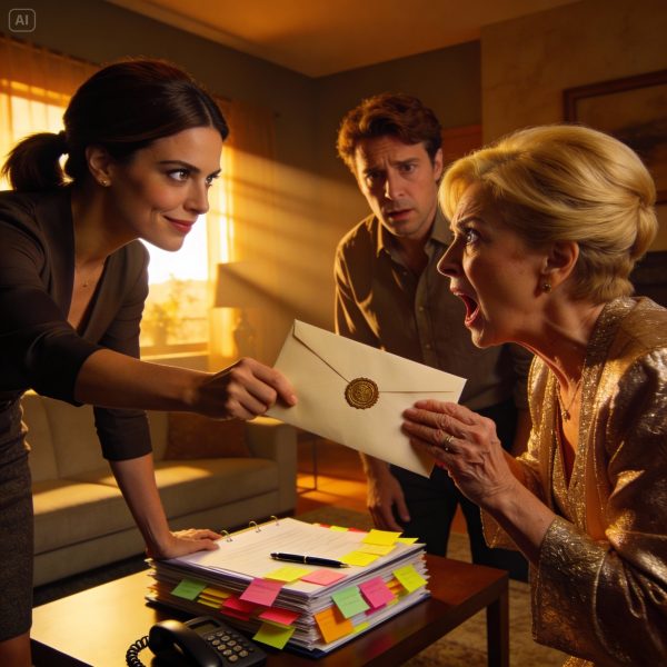 Apenas había terminado de leer los documentos cuando mi esposo, Daniel, y mi suegra, Patricia, aparecieron en mi apartamento como si hubieran estado esperando en el pasillo. Patricia llevaba una carpeta propia, con pestañas y notas adhesivas por todas partes, como si ya hubiera hecho planes para mi herencia.