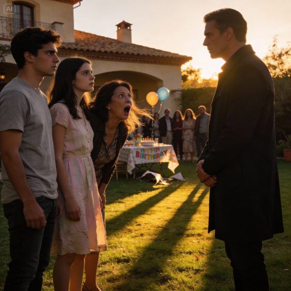 Mamá se detuvo a tres pasos de la puerta. Se le cortó la respiración y la sala llena de invitados pareció desvanecerse a su alrededor mientras miraba fijamente al hombre. La tensión no era intensa; era aguda, de esas que hacen que todos se queden quietos instintivamente.