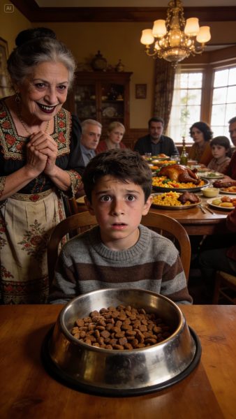 En la cena de Acción de Gracias, el lugar de mi hijo no tenía plato… tenía un cuenco de perro lleno de croquetas. Me quedé paralizada. Levanté la vista y vi a mi suegra sonreír, cruel: “Un niño de alguien del barrio bajo no necesita banquete”. Mi hijo apretó los labios, tragándose las lágrimas. Yo no grité. Solo tomé su mano y nos fuimos en silencio, con todas las miradas clavadas en la espalda. Ellos pensaron que habían ganado. Pero al día siguiente, mi suegra apareció en mi puerta, temblando, en pánico… porque alguien había visto lo que hizo. Y no era yo.