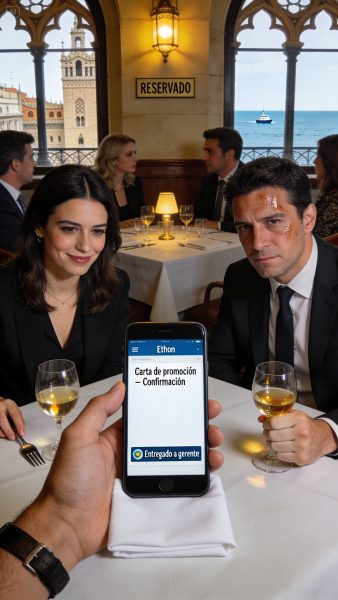 Saqué el móvil y lo dejé sobre el mantel, sin mostrarlo todavía, como quien deja una carta boca abajo. En la pantalla, un correo reenviado desde el servidor interno, con fecha, asunto y adjunto: “Carta de promoción – Confirmación”. Y debajo, una captura de pantalla del sistema de gestión con un log: “Entregado a gerente directo”.