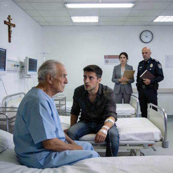 Cuando Daniel despertó, ya no estábamos en la casa del pueblo, sino en una habitación de hospital, blanca y ruidosa. Yo estaba sentado junto a la ventana, conectado a mi propio monitor cardíaco, más por prevención que por necesidad. A los pies de su cama había dos personas que él no conocía: una mujer con traje gris y un hombre calvo con libreta. Se presentaron como inspectores. Sobre la mesita metálica descansaba la misma bolsa de plástico con la botella y el vaso.