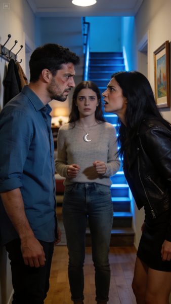 Detrás de ella, en el rellano, asomaba Claudia, con el colgante de luna colgando del cuello, brillando como una acusación.