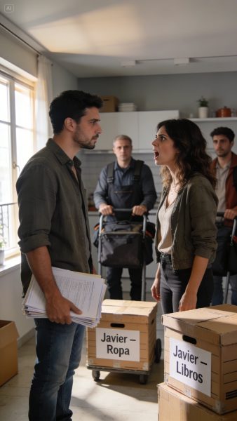 En menos de diez minutos, el piso se convirtió en un campo de batalla organizado: cajas, rollos de cinta adhesiva, mantas para proteger muebles. Javier había señalado previamente lo que era suyo con pequeños post-its amarillos.