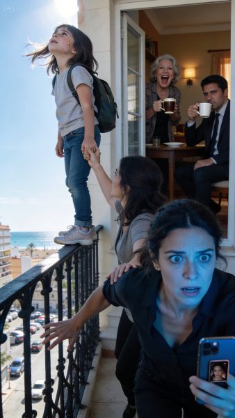 La puerta del piso estaba entornada. Entré sin llamar y el aire olía a café recién hecho y a tranquilidad ajena. Entonces lo vi: mi hija, Sienna, de ocho años, de pie sobre la baranda del balcón del segundo piso. No sentada detrás, no segura. Arriba. Temblando. Con las manos aferradas al hierro como si el hierro fuera su última promesa.