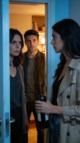 En el rellano estaba Clara. Vaqueros ajustados, un top negro bajo un abrigo beige, los labios pintados de rojo y una botella de vino en la mano. Traía también una sonrisa nerviosa, que se borró al verme.