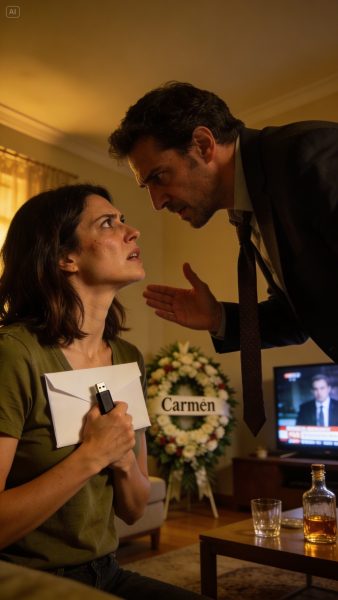 De camino a casa, el mensaje seguía clavado en la pantalla del móvil. No respondí. Me limité a revisar cada cara en el metro, convencida de que alguien me observaba. Al llegar al piso de Diego en Arganzuela, el salón estaba lleno de flores recién llegadas del tanatorio, que él había mandado colocar. El televisor estaba encendido sin sonido. Diego, con traje oscuro y cuello desabrochado, bebía whisky.