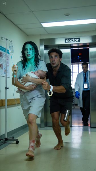 Acababa de dar a luz cuando la puerta se abrió de golpe a medianoche. Mi esposo entró pálido, temblando, con los ojos desorbitados. “¡Corre ahora! ¡Agarra al bebé!” Yo aún tenía la vía en el brazo. “¿Por qué?” Él tragó saliva: “¡No preguntes… te lo explico en el coche!” Me arrancó la pulsera del hospital y me cargó medio descalza por el pasillo. Al alejarnos, miré atrás… y se me heló la sangre al ver quién estaba en la puerta.