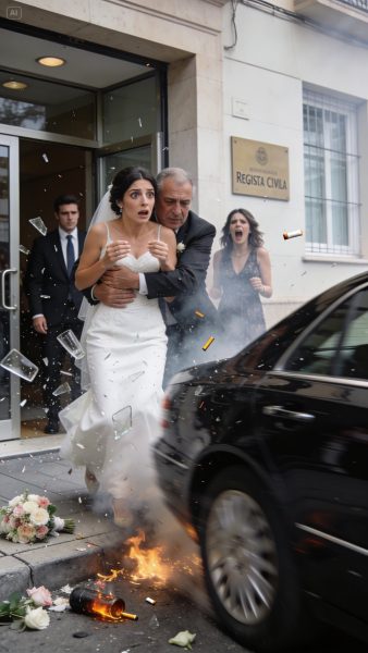 Un día antes de mi boda, el hombre que nos abandonó—mi padre—me interceptó frente a mi oficina. Olor a cigarrillo, ojos cansados. “Mañana, cuando salgas del registro… no te subas a ningún coche.” Me reí con sarcasmo. “¿Ahora te importa?” Él no se defendió, solo apretó la mandíbula: “No confíes en nadie. Ni en quien te lleva el ramo.” Me fui pensando que era teatro. Pero el día de la boda, al salir con el vestido y las manos temblando, vi el auto acercarse… y escuché su grito. Mi padre se lanzó, me empujó al suelo… y el estruendo que siguió me cambió la vida.